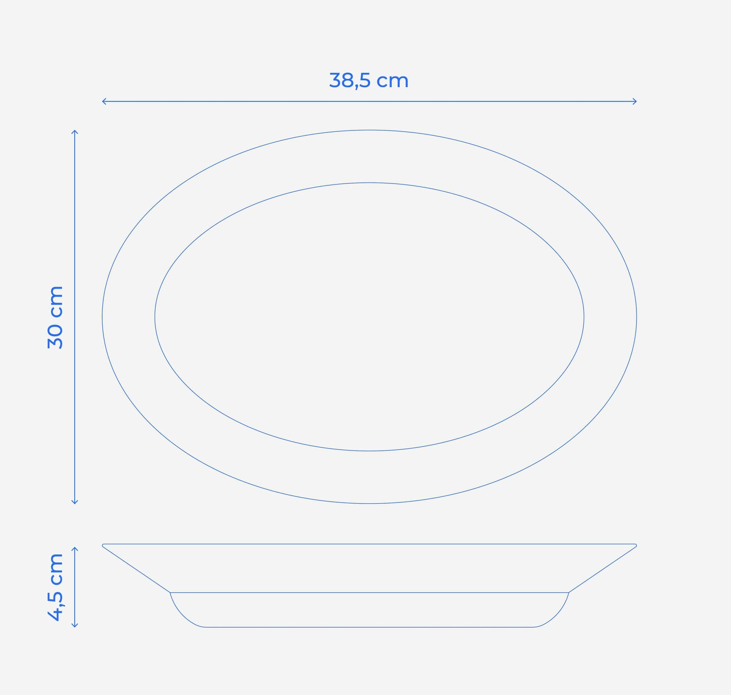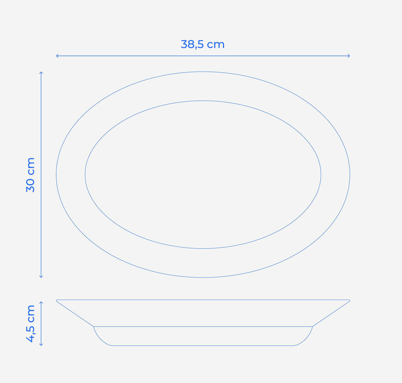 The serving dish measures 38.5 x 29.5 x 5 cm. It is ideal for serving up to 6 people, whether for a main course, a large salad, or a generous dessert.